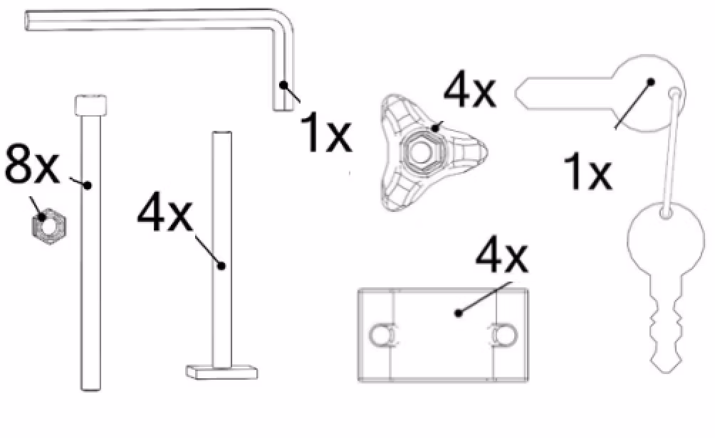Förpackningen innehåller allt du behöver för att montera skidhållarna på alla takräcken med T-spårsprofil (20 mm) på ovansidan eller på takräcken av fyrkantsprofil 25x30 mm. Du får även med förhöjningsbrickor som är lämpliga att använda på takräcken med mycket låg profil för att undivka att skidornas bindning slår i taket.